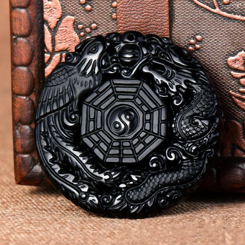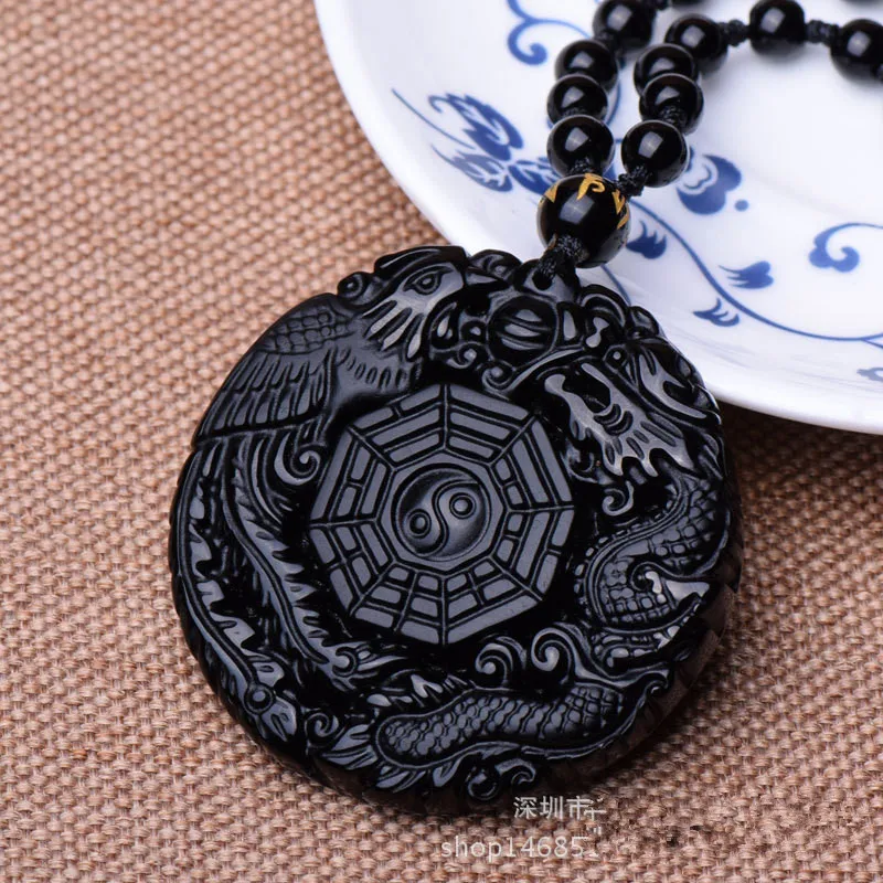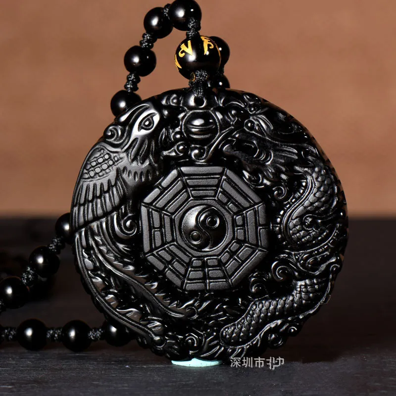 Most effective Natural Black Obsidian Hand Carved Chinese Dragon Phoenix BaGua Lucky Amulet Pendant Free Necklace