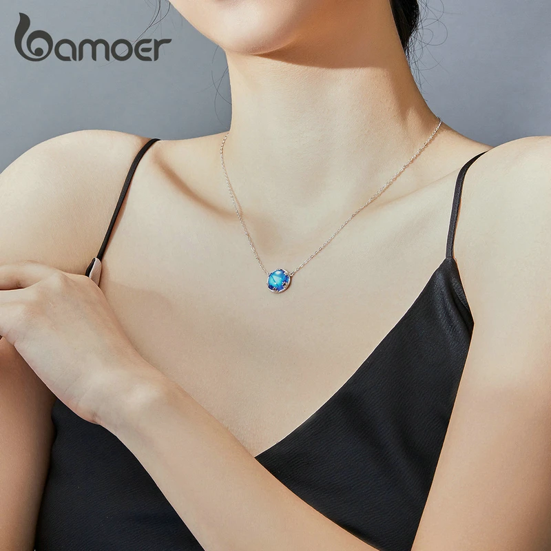 wonderful BAMOER Classic 925 Sterling Silver Blue Ocean Crystal Pendant Necklaces Women Fashion Jewelry Engag
